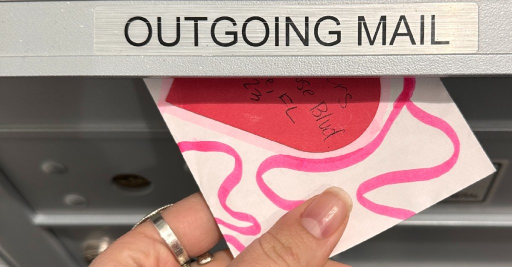 I like to decorate the envelope. This month, I pasted a red heart to the front and wrote the address on it. And if you can tell from the cover image, I forgot to put a stamp on it…oops. Still waiting for it to come back so I can give it another try.