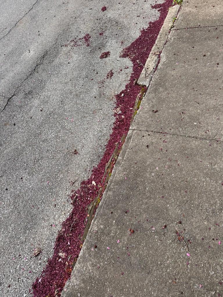 As I get closer to my apartment, I look down to find clumps of pink petals have found their way to the edges of the street, the way rain runs next to the sidewalk during a storm. Another celebration of spring.